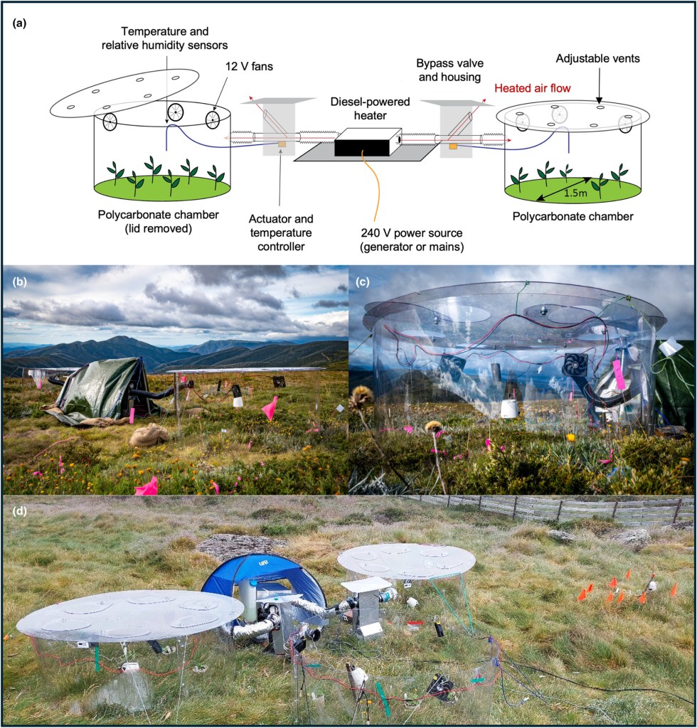 Heatwaves are increasing in intensity, duration and frequency, but studying heatwaves in field conditions (in situ) remains challenging. Here authors designed and built equipment for simulating an extreme heat event under field conditions that combines passive warming in semi-enclosed chambers and active convective heating, using portable diesel heaters to supply warm air to 1.5 m diameter cylindrical chambers. The active heating systems can be programmed with target temperature profiles to heat day and night. The design can be applied to simulate an array of extreme heat scenarios on ecological communities, including night-time warming, daytime extremes, varying heat intensity, duration, event frequency, recovery period lengths and combinations thereof.