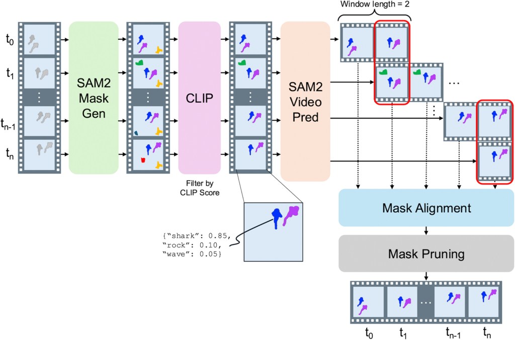 Development of Machine Learning (ML) models for analysing marine animal aerial imagery has followed the classical paradigm of training, testing and deploying a new model for each dataset, requiring significant time, human effort and ML expertise. Here authors introduce Frame-Level Alignment and Tracking (FLAIR), which leverages the video understanding of Segment Anything Model 2 (SAM 2) and the vision-language capabilities of Contrastive Language-Image Pre-training (CLIP). FLAIR takes a drone video as input and outputs segmentation masks of the species of interest across the video. Notably, FLAIR leverages a zero-shot approach, eliminating the need for labelled data, training a new model or fine-tuning an existing model to generalize to other species.